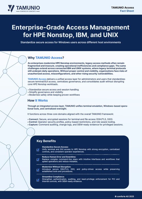 Standardize secure, user-friendly access to HPE Nonstop. TAMUNIO Access unifies terminal, GUI, and file-transfer connections under SSH/TLS and enterprise SSO, making administrative work safer, simpler, and fully auditable.