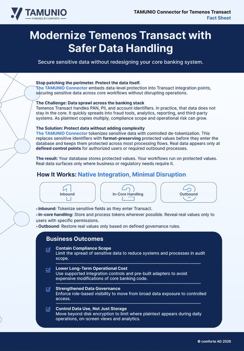 This fact sheet shows how the TAMUNIO Connector embeds data-level protection into Transact integration points, securing PAN and PII before they spread into analytics, fraud platforms, AI initiatives, reports, and third-party systems. Delivered jointly by ITSS and comforte, the approach fits core banking change control and avoids costly code changes.