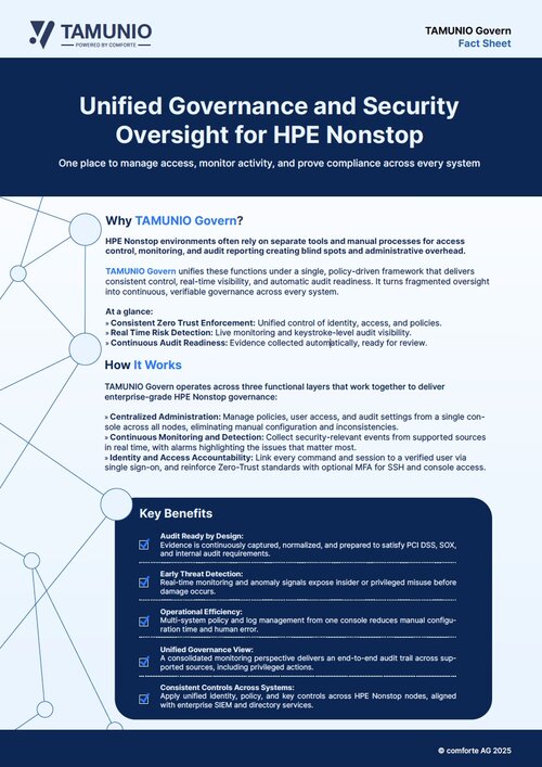 Gain complete visibility and control over HPE Nonstop security. TAMUNIO Govern centralizes Safeguard administration, monitoring, and compliance reporting to simplify audits, detect risks faster, and enforce Zero-Trust policies across all systems.