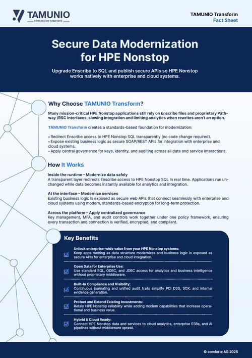 Modernize HPE Nonstop data and services without rewriting code. TAMUNIO Transform moves Enscribe workloads to SQL and exposes business logic as secure APIs, connecting proven systems directly to cloud and enterprise applications.